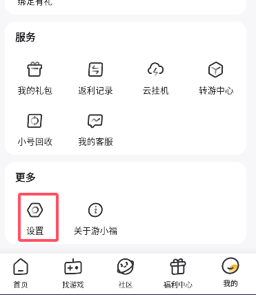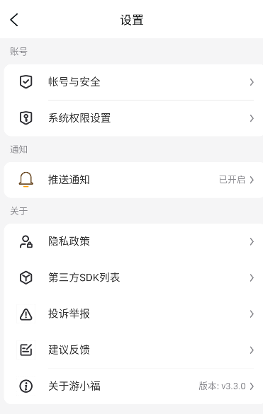 3、进入设置页面以后,往下滑,找到【关于游小福】,然后点击右侧的版本号。