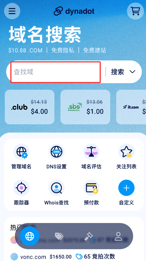 2、首页搜索栏支持输入关键词查询域名可用性,实时显示注册状态和价格信息。