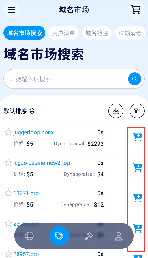 3、域名交易市场展示各类待售域名,点击购物车图标可将心仪域名加入购买清单。