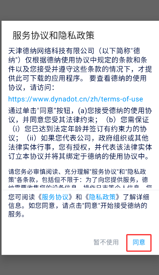 1、首次启动应用会显示用户协议页面,点击"同意"按钮后即可进入域名服务主界面。