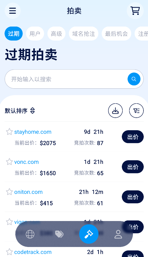 4、拍卖专区包含过期域名竞拍,通过搜索找到目标域名后即可参与出价竞购。