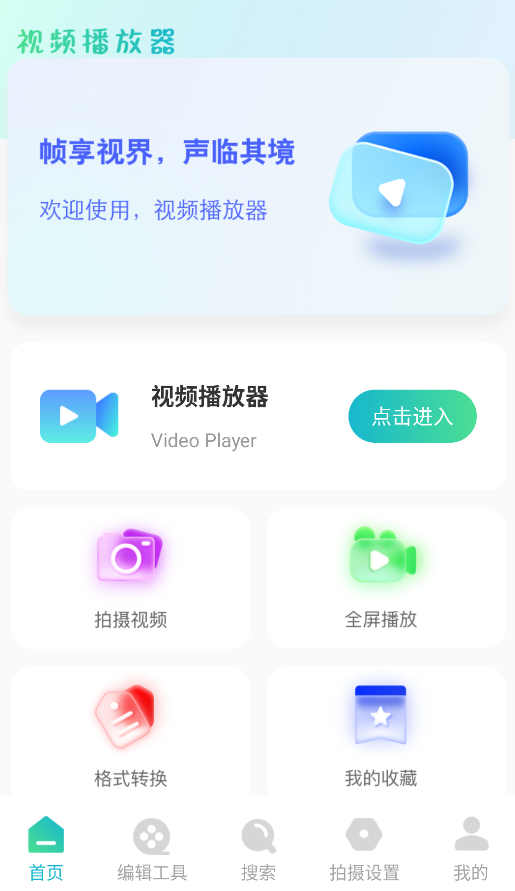 1、启动软件后,在主页可直接播放本地视频,还能拍摄新素材、切换全屏模式、转换文件格式或查看收藏内容。