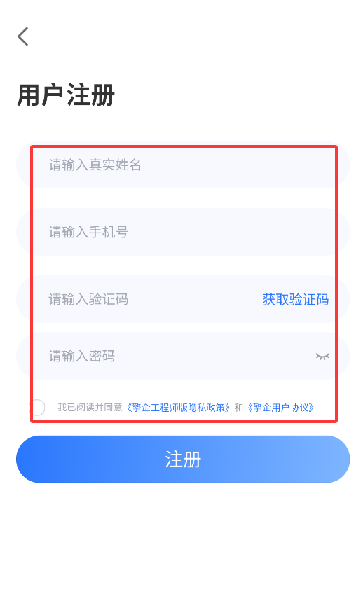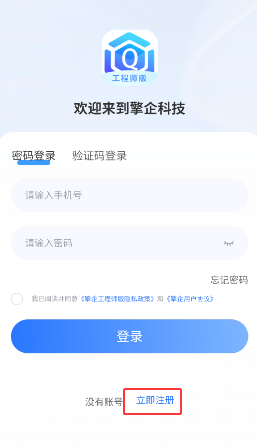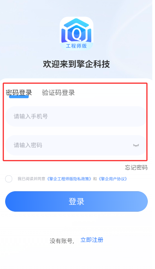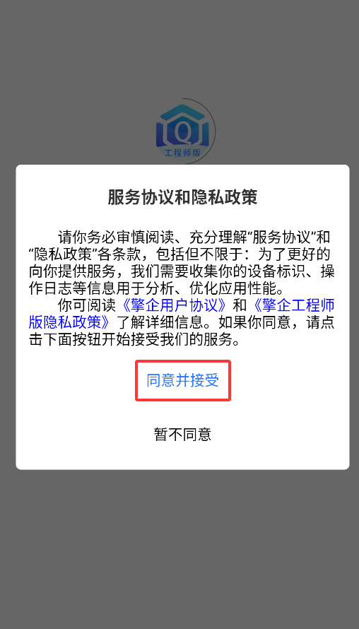 1、首次启动擎企工程师版APP会显示用户协议弹窗,点击"同意"按钮后进入登录页面。