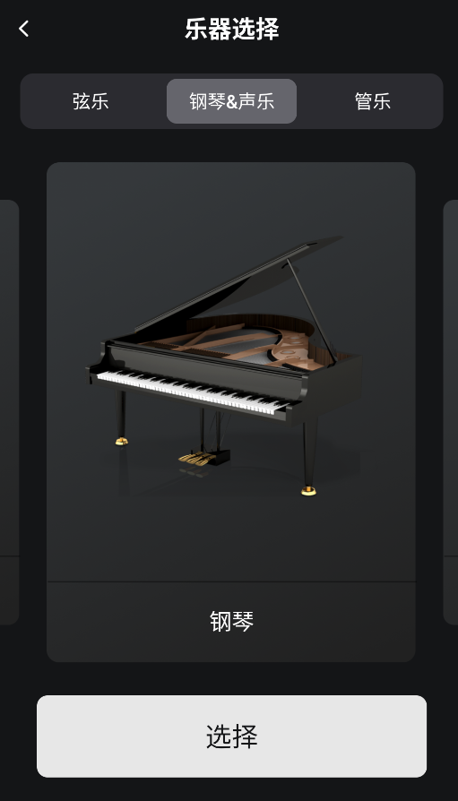 3、"乐器选择"支持多种乐器学习切换,包含钢琴/声乐、小提琴等弦乐、长笛等管乐共6大类乐器。