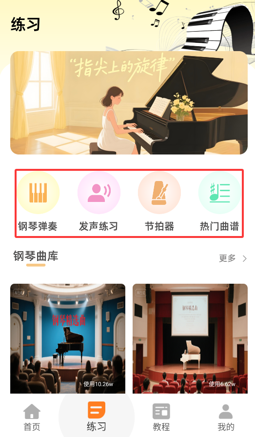 2、进入"练习模式"后,可使用智能钢琴伴奏、发声训练、可调速节拍器及热门曲谱跟弹等专业功能。