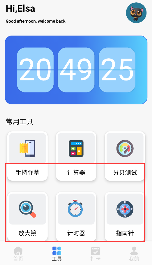 3、工具箱集合了多种实用小工具:手持弹幕、科学计算器、环境分贝测试、放大镜、计时器和指南针等。