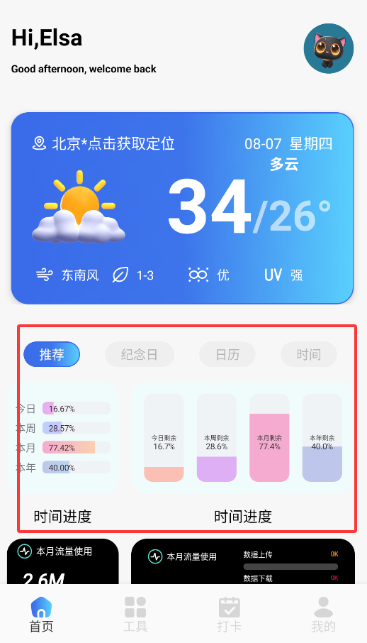 2、首页提供多种实用功能入口,包括个性化推荐、纪念日提醒、日历查询和时间进度显示等生活工具。