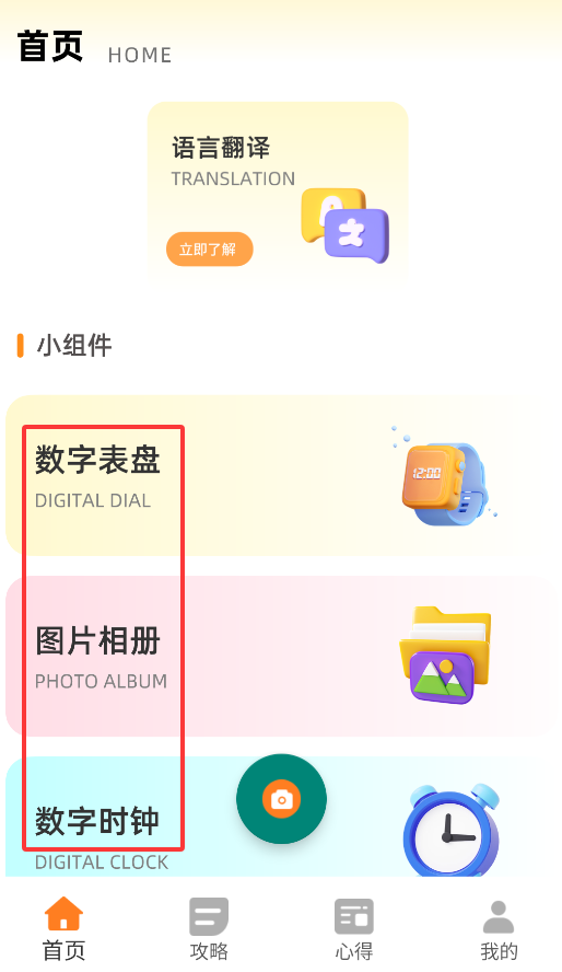 2、首页提供多种实用工具:数字表盘时钟、相册管理、数字时钟及即时翻译功能入口。