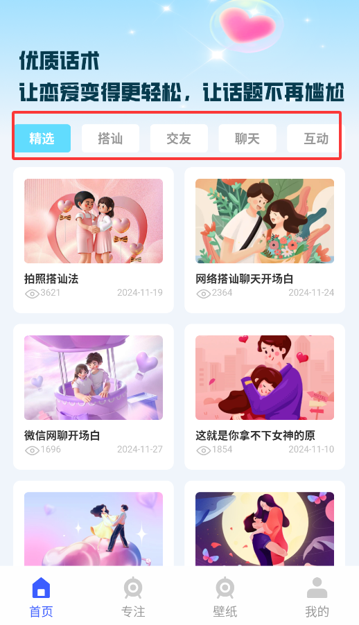 1、该应用集恋爱语录、专注训练和壁纸美化于一体整合,提供多功能的日常生活服务支持与帮助。