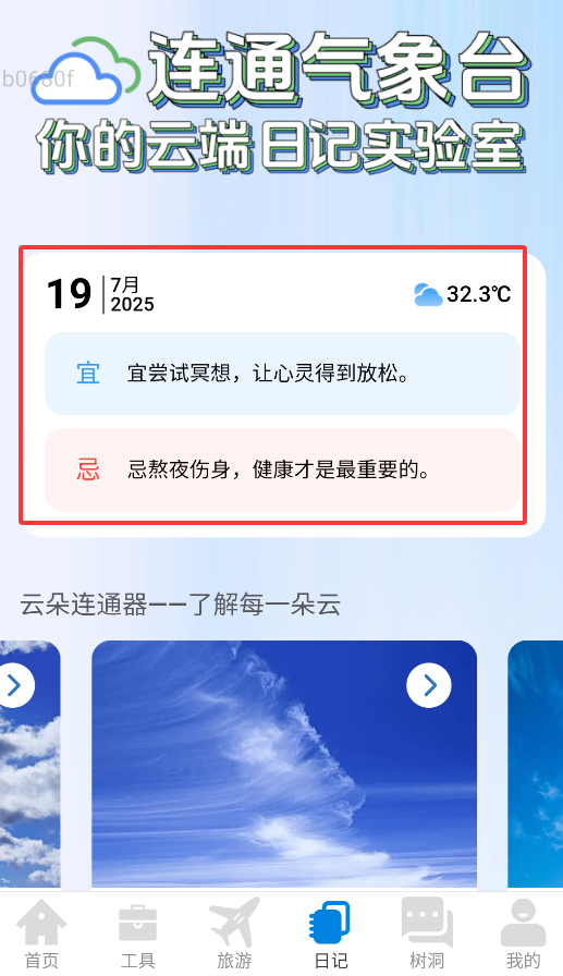 4、提供气象预报精准信息、生活宜忌提示及云日记功能,搭配自然音效舒适与聊天倾诉,兼顾实用与情感需求体验。