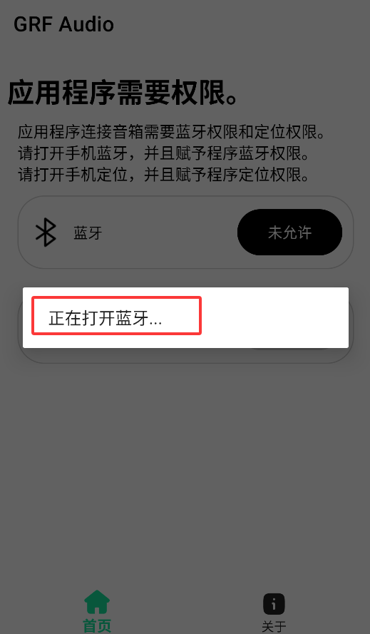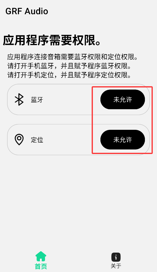 2、在连接前需授权蓝牙和定位权限,点击"未允许"跳转系统设置开启权限。