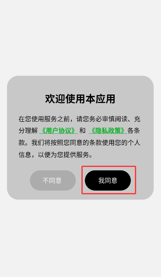 1、首次启动APP会弹出用户协议,点击"同意"后进入蓝牙管理界面。