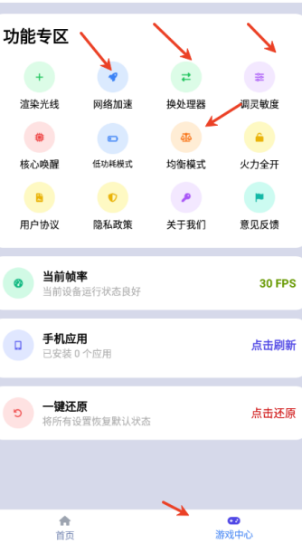 2、包含换处理器、核心唤醒、调灵敏度等功能,可改善设备运行状态,同时提供当前设备运行状态查看和应用安装情况刷新功能。