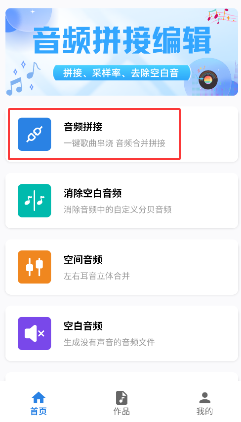 1、打开APP后,在首页点击"音频拼接"功能,进入多段音频合并编辑界面。