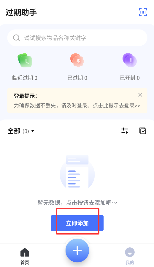 1、打开APP后,在首页点击"立即添加"按钮,开始录入需要管理的物品信息。