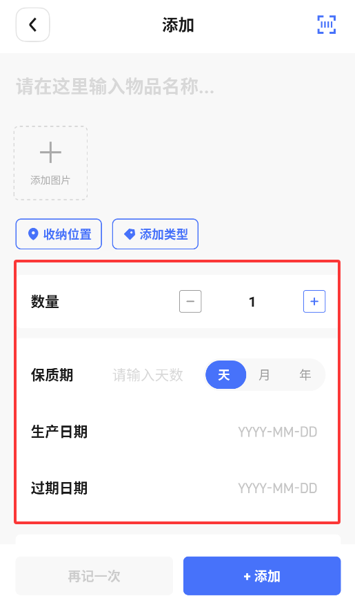 2、进入添加页面后,手动填写物品名称、上传照片、设置数量,并记录保质期、生产日期和过期日期等关键信息。