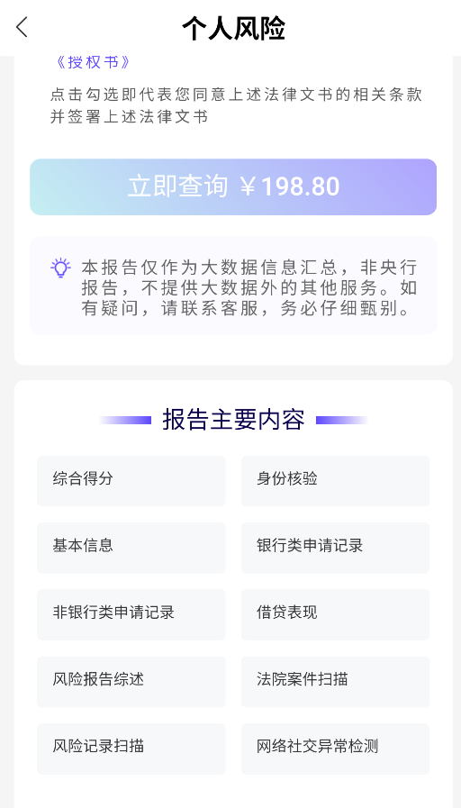 2、进入"个人风险"查询功能,系统将生成包含综合信用评分、身份验证结果、基础信息及金融申请记录等内容的详细报告。