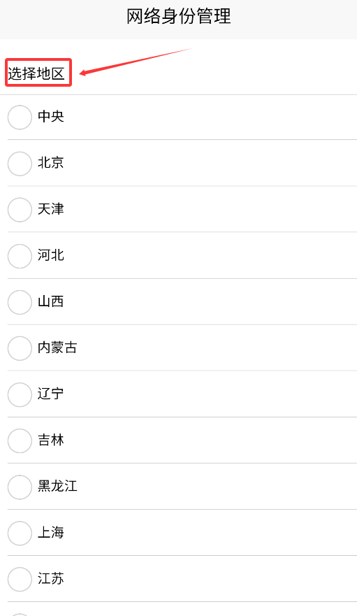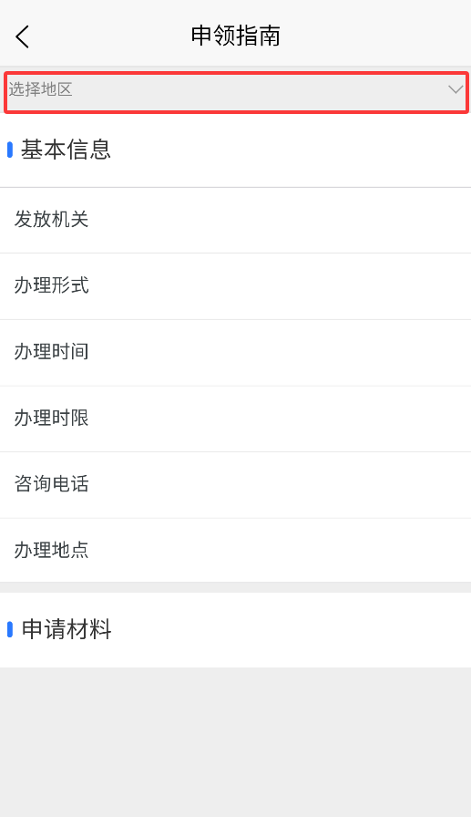 2、主界面要求选择所在行政区域,系统将自动匹配当地凭证服务政策。