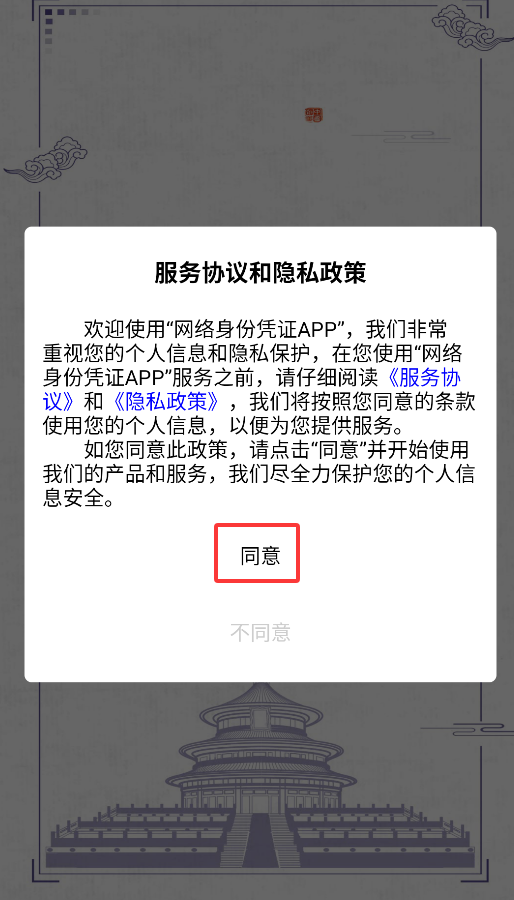 1、首次启动应用会弹出协议确认窗口,必须点击同意按钮才能进入身份管理平台。