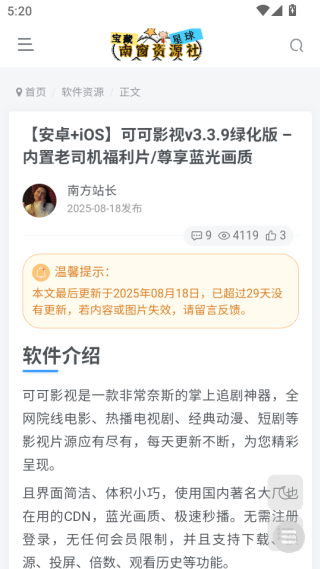 2、点击感兴趣的资源,进入到介绍页面,这里可以查看软件的简介以及下载地址。