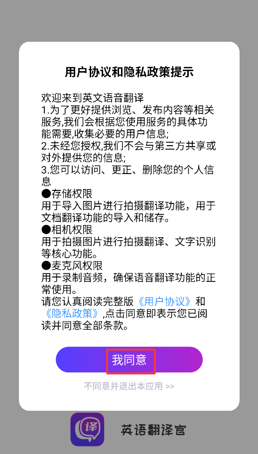 1、首次启动APP会弹出用户协议,点击"同意"后即可进入翻译功能主界面。
