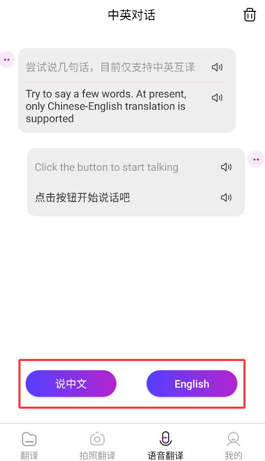4、语音翻译功能允许直接说出中文或英文,系统会即时翻译并播放目标语言的发音。