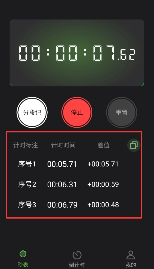 2、系统会自动保存每次计时数据,详细显示序号、累计时长及各分段的时间差值。