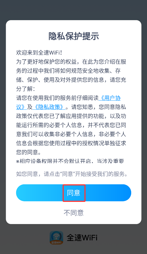 1、首次启动APP会弹出用户协议,点击"同意"后即可进入网络优化工具主界面。