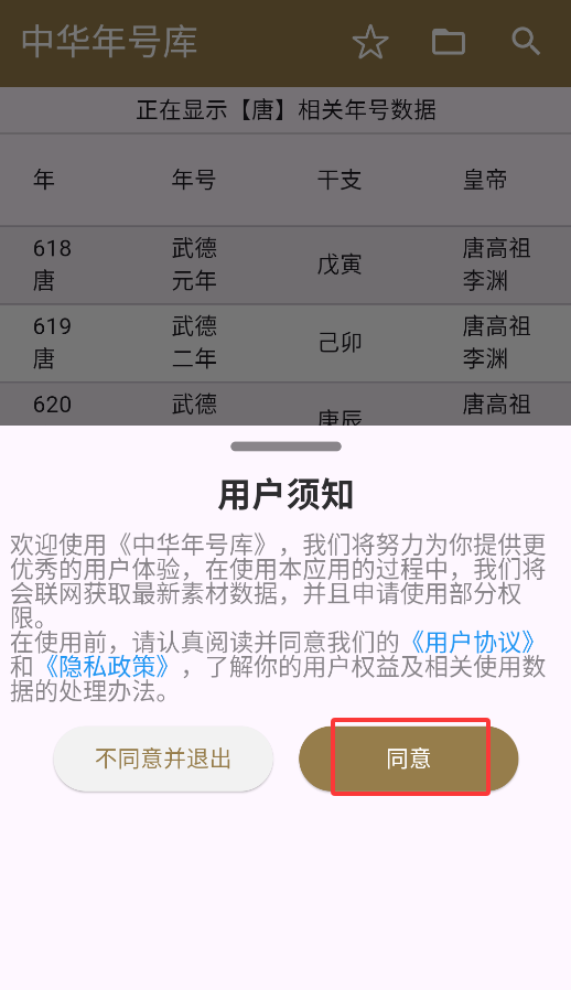 1、首次启动APP会弹出用户协议,点击"同意"后即可进入历史年号查询平台主界面。