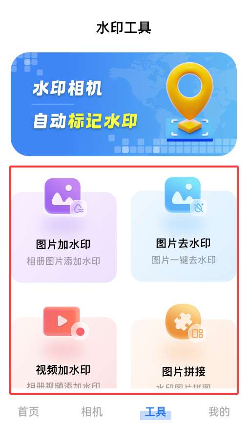 4、在"工具箱"中可进行图片/视频处理,如添加/去除水印、多图拼接等编辑操作。