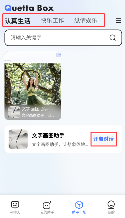 2、在"助手市场"可选择生活、工作、娱乐等场景的专属AI助手,添加后即可开启智能对话。