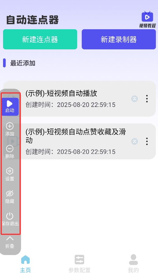 3、左侧控制栏提供启动/暂停、添加点击点、删除点位、参数设置、隐藏悬浮窗及保存配置等功能。