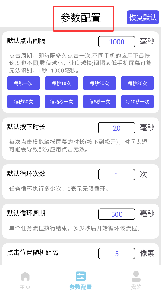 1、全局参数完全支持自定义,可详细设置点击间隔、触摸时长及重复执行次数,并提供多种快捷预设选项。