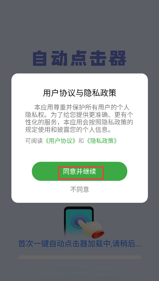 1、首次启动APP会弹出用户协议,点击"同意"后即可进入自动点击工具主界面。