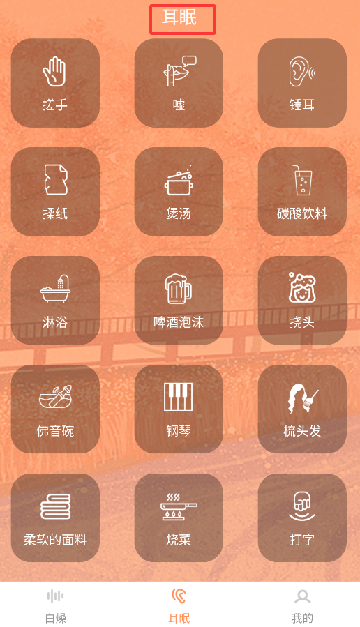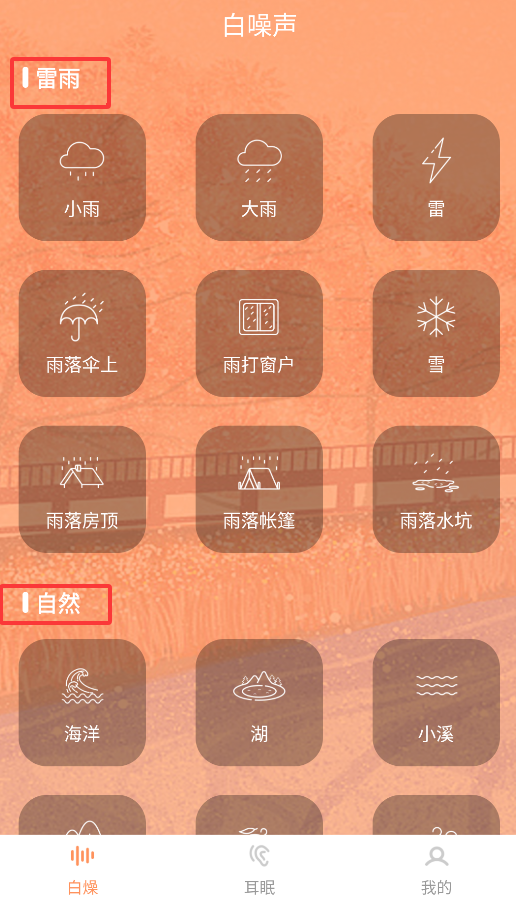 2、在"白噪音"专区,提供暴雨、溪流、森林等自然音效分类,可自由选择喜欢的背景音。