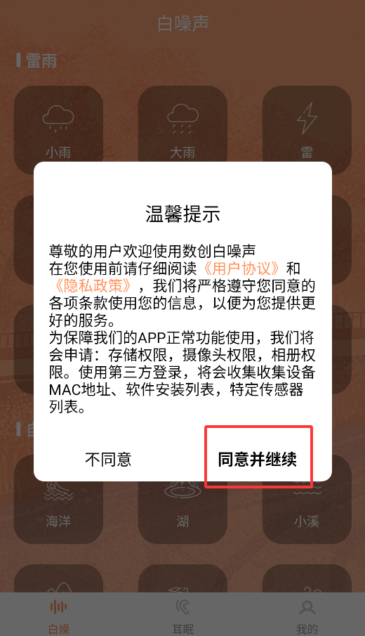 1、首次启动APP会显示用户协议和隐私条款,阅读后点击"同意"按钮即可进入主界面。