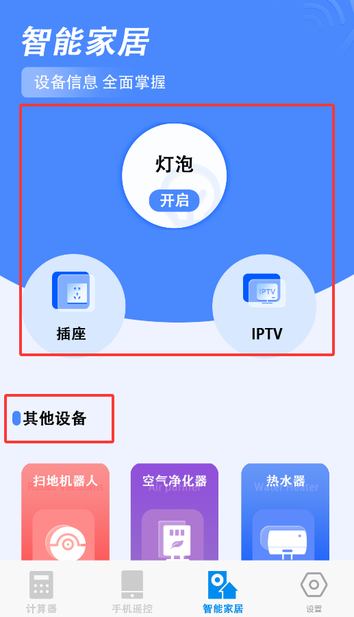 4、智能家居控制兼容主流智能灯泡、插座、网络电视等设备,支持多设备联动场景设置。