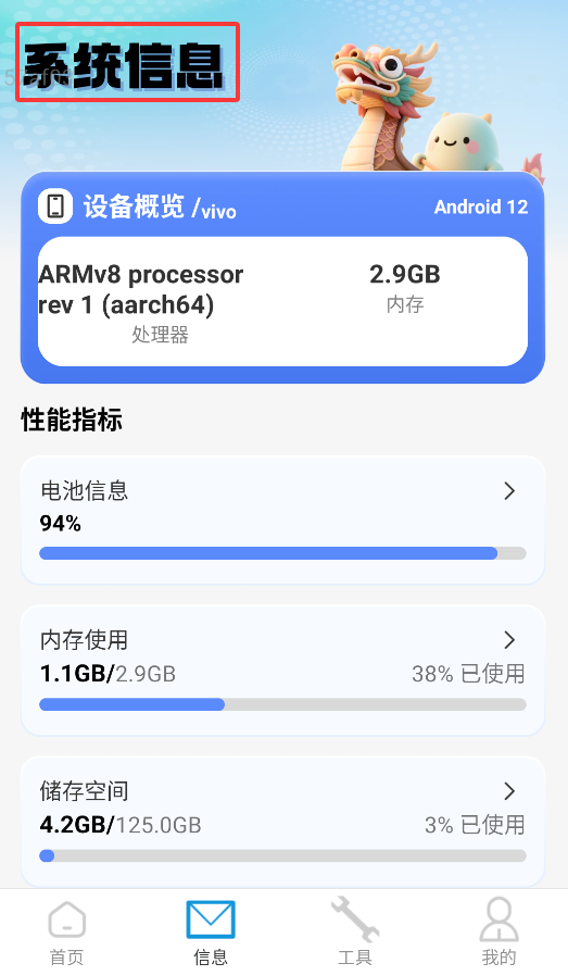 3、设备信息页面显示当前网络状态、设备性能数据及系统运行情况等详细参数。