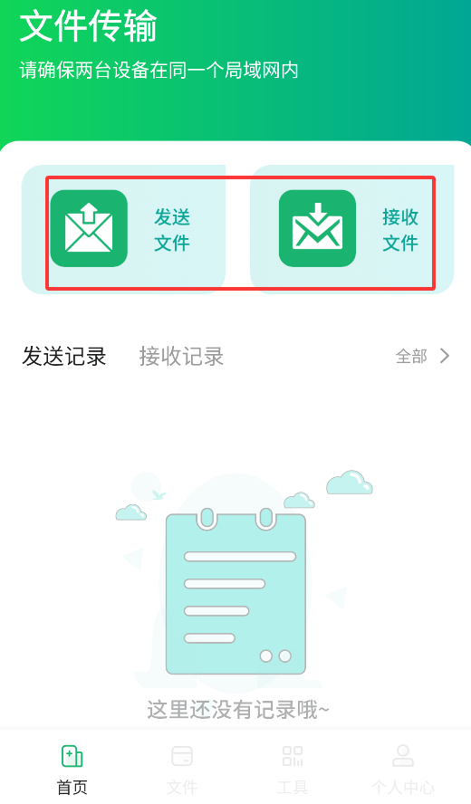 2、主页面提供核心传输功能,支持快速发送和接收各类电子文件数据。