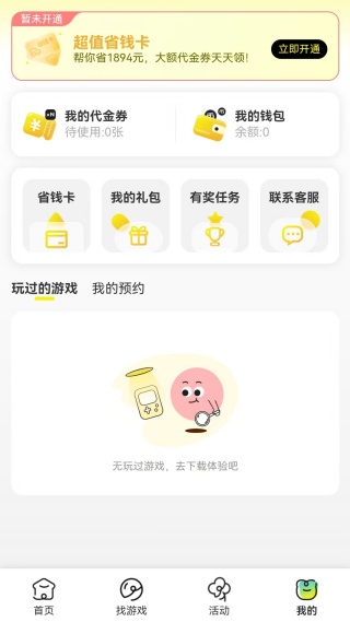 4、在“我的”模块,则能看看自己的代金券、钱包余额,还能查看玩过的游戏。