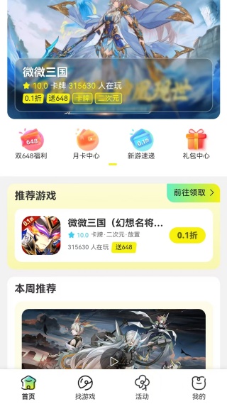 1、用户进入首页就会看到推荐游戏,还有本周推荐,根据需求选择来玩。