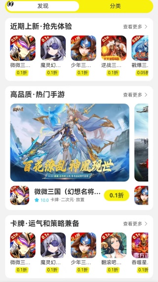 2、进入找游戏模块,能看到很多高品质热门手游,分类详细,随时体验。