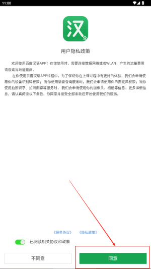 1、点击“同意”按钮,以便顺利进入应用主界面,准备进行设置。