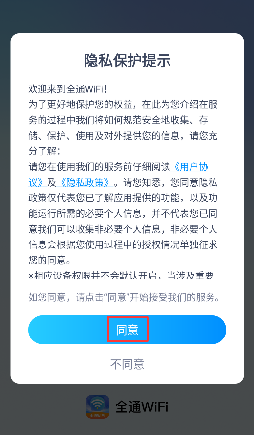 1、首次启动APP会弹出用户协议,点击"同意"后即可进入WiFi管理工具主界面。