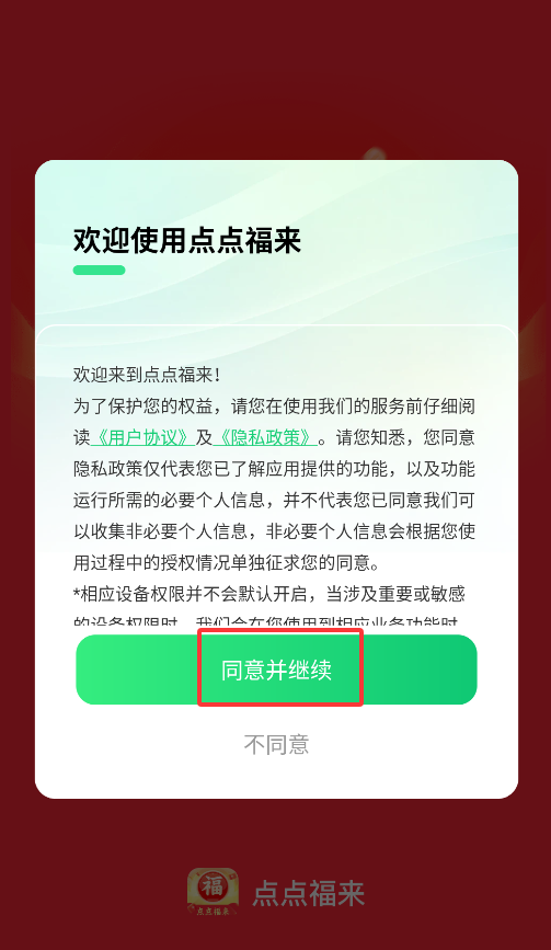 1、首次启动APP会显示用户协议,点击"同意并继续"后即可参与红包活动。