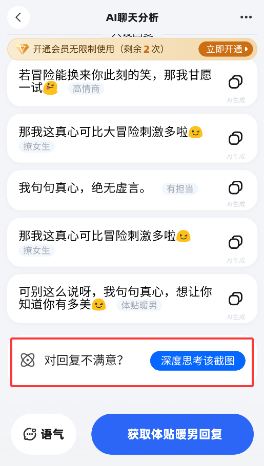 3、若对AI生成的回复不满意,可使用"深度分析"功能对聊天内容进行多维度情感和逻辑解析。