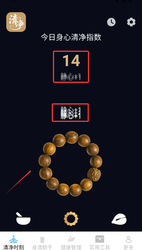1、打开APP后,在"清静时刻"界面点击中央按钮,每次点击都能提升当前身心清净指数数值。