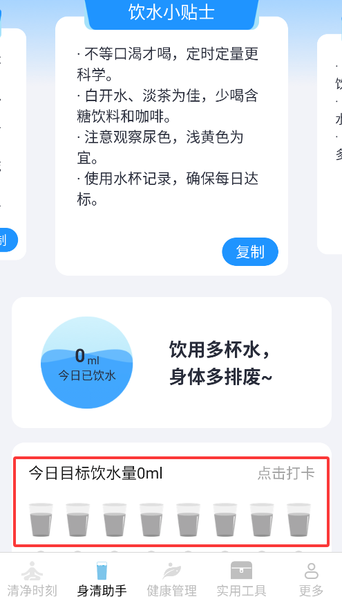 2、进入"身清助手"模块,可使用每日饮水提醒功能,通过打卡完成每日喝水目标。