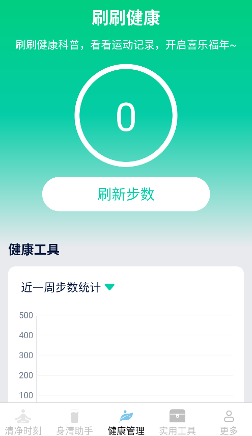 3、在"健康管理"页面,可实时更新步数数据,并查看最近7天的运动步数统计图表。