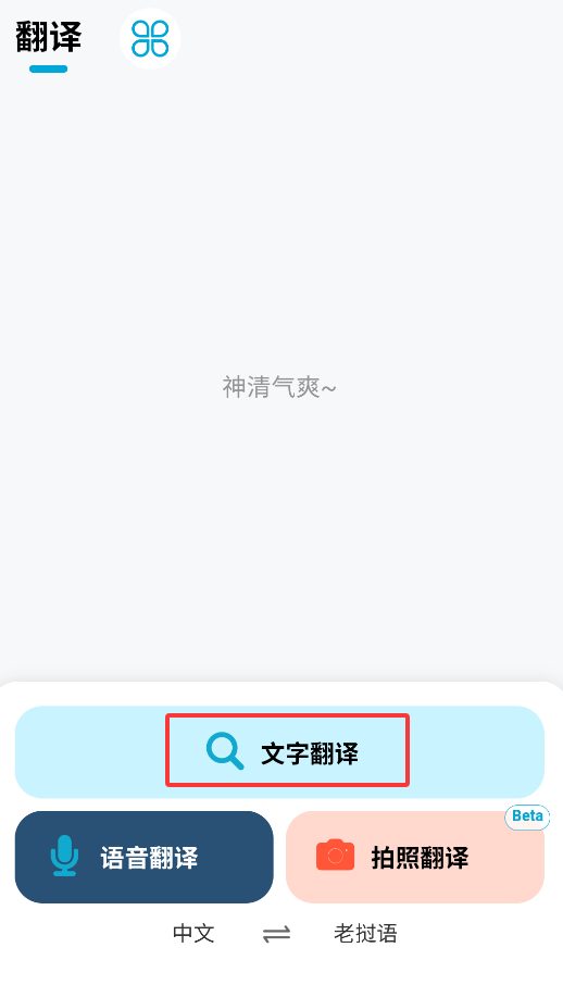 2、首页中央设有"文字翻译"功能入口,点击即可进入文本翻译页面。